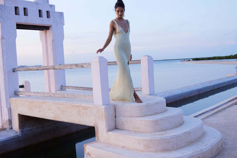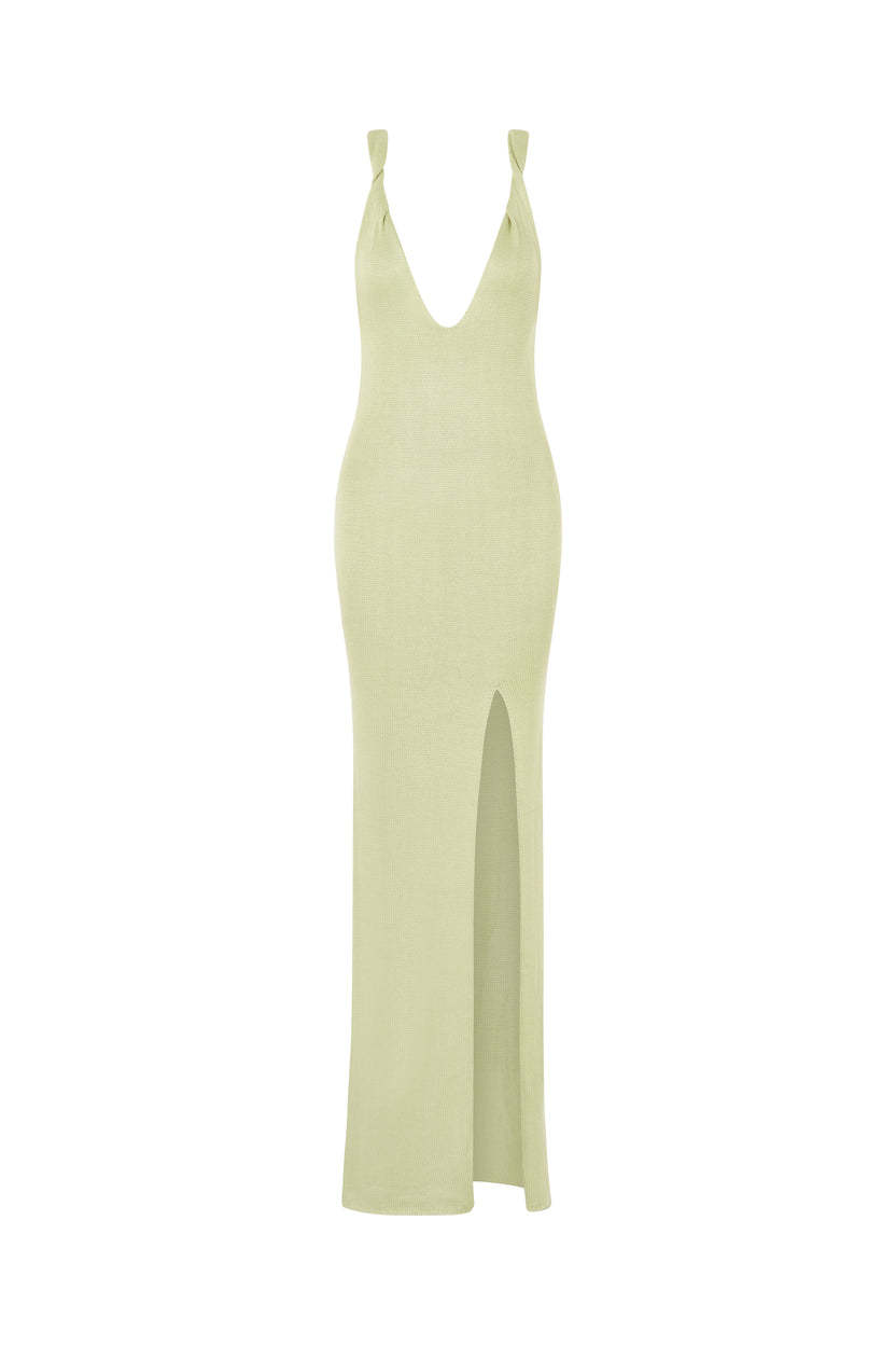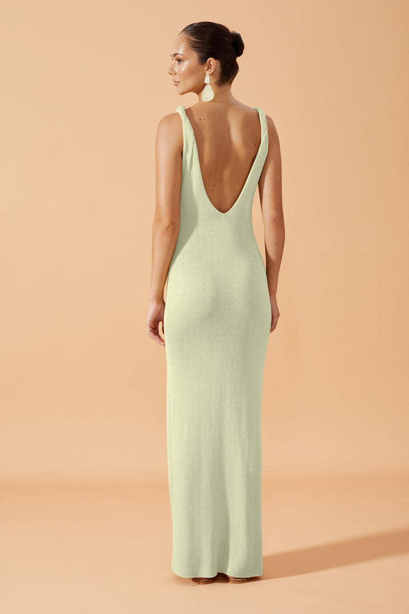 Summer Sexy Deep V Plunge Neck Backless Slit Knitted Dress Solid Color High Waist Slim Fit Holiday Beach