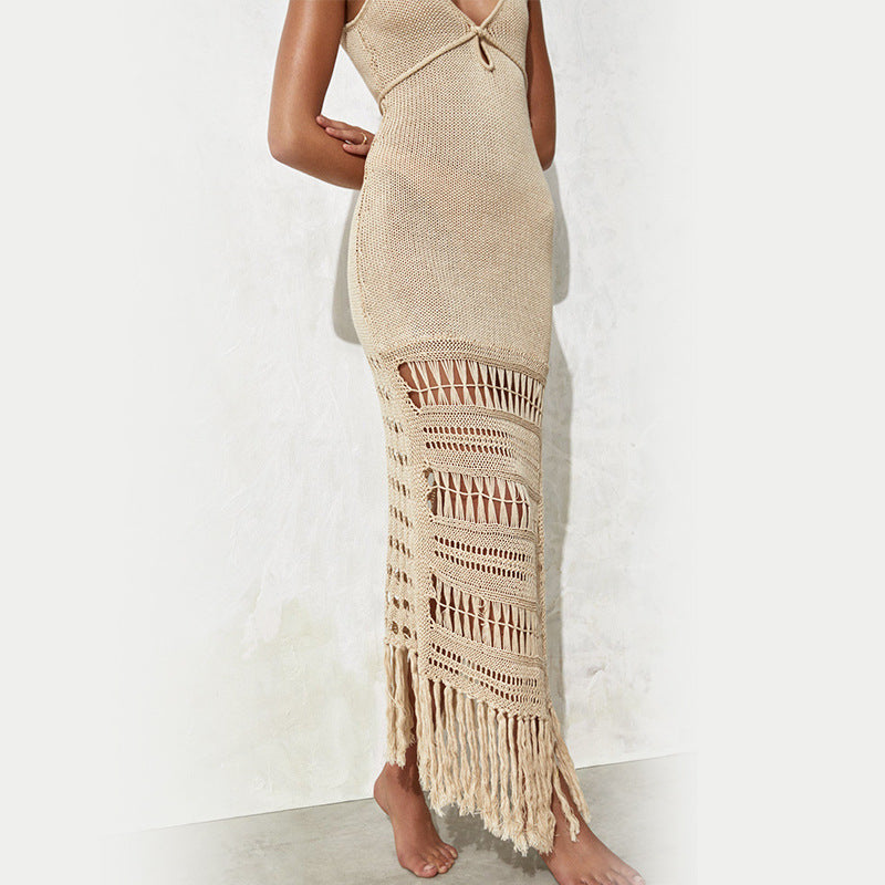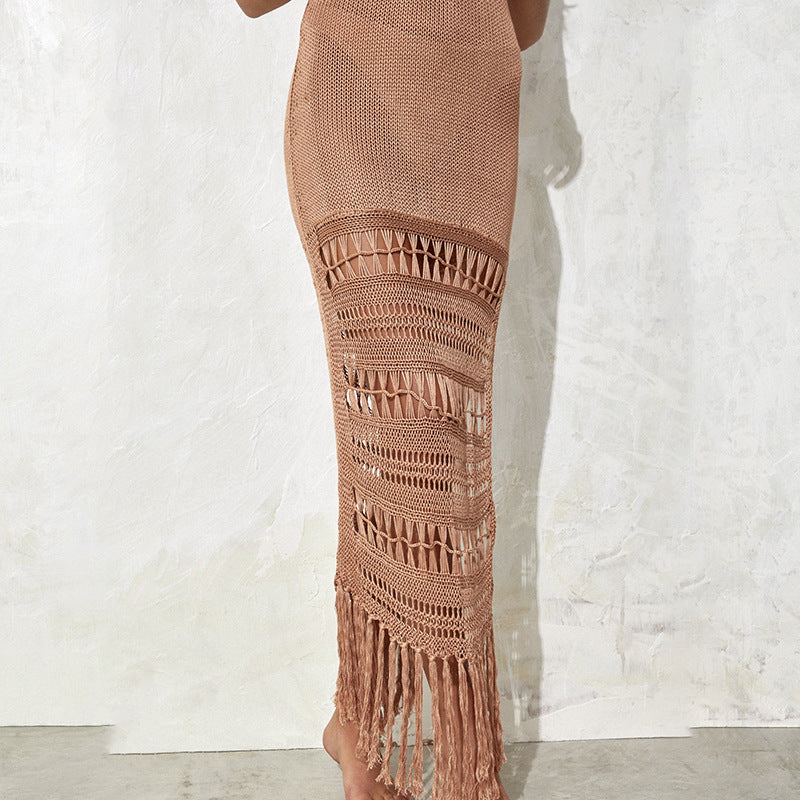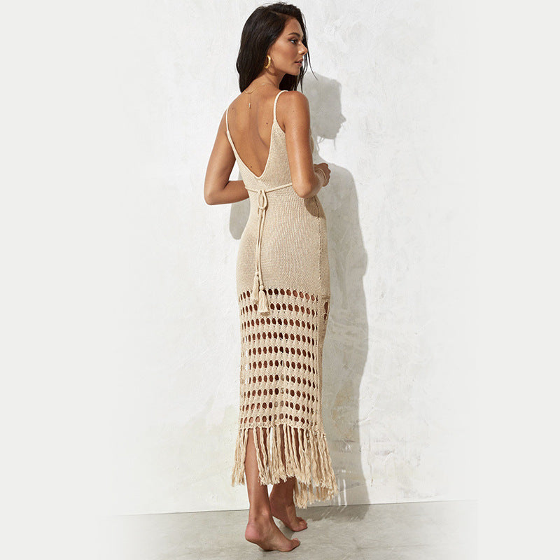 Summer Beach Dress Women Solid Color Spaghetti Straps Knitted Hollow Out Cinched Tassel Midi Swimsuit Blouse